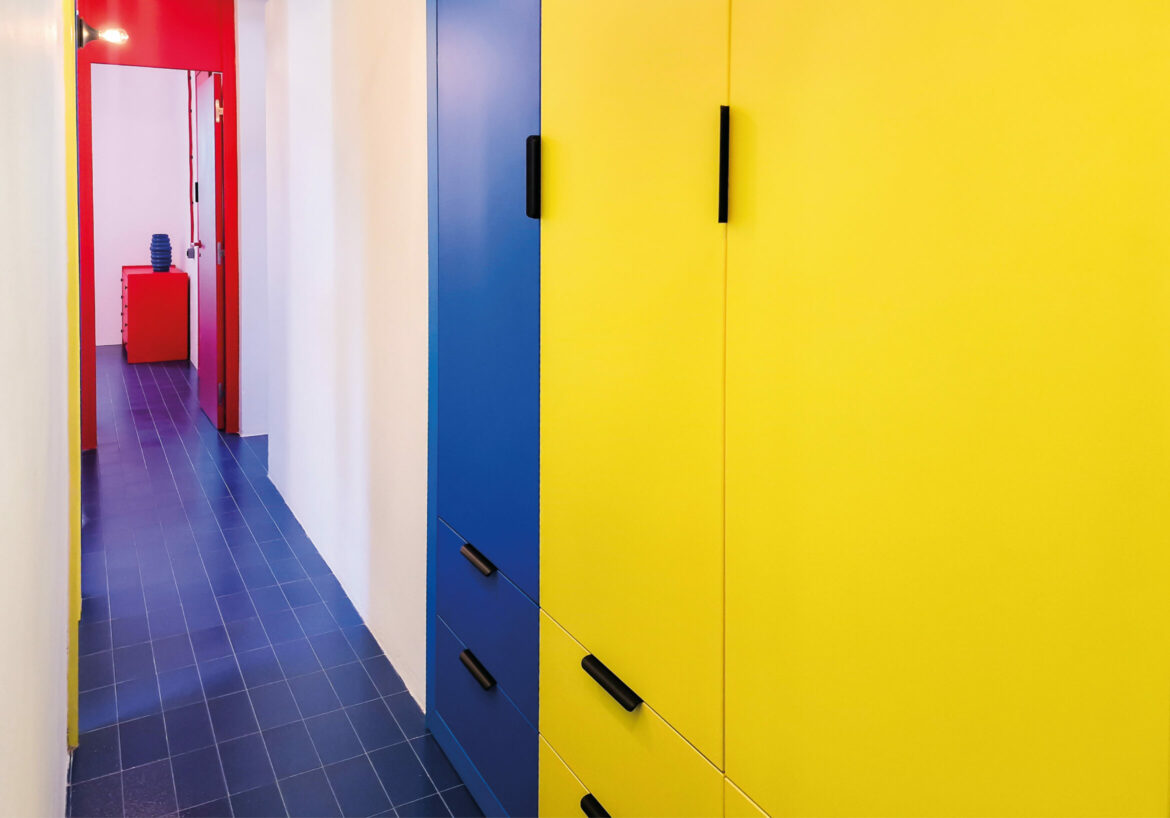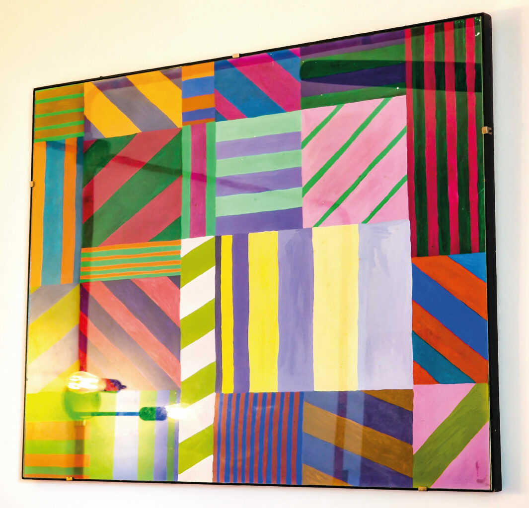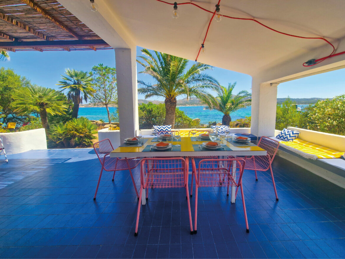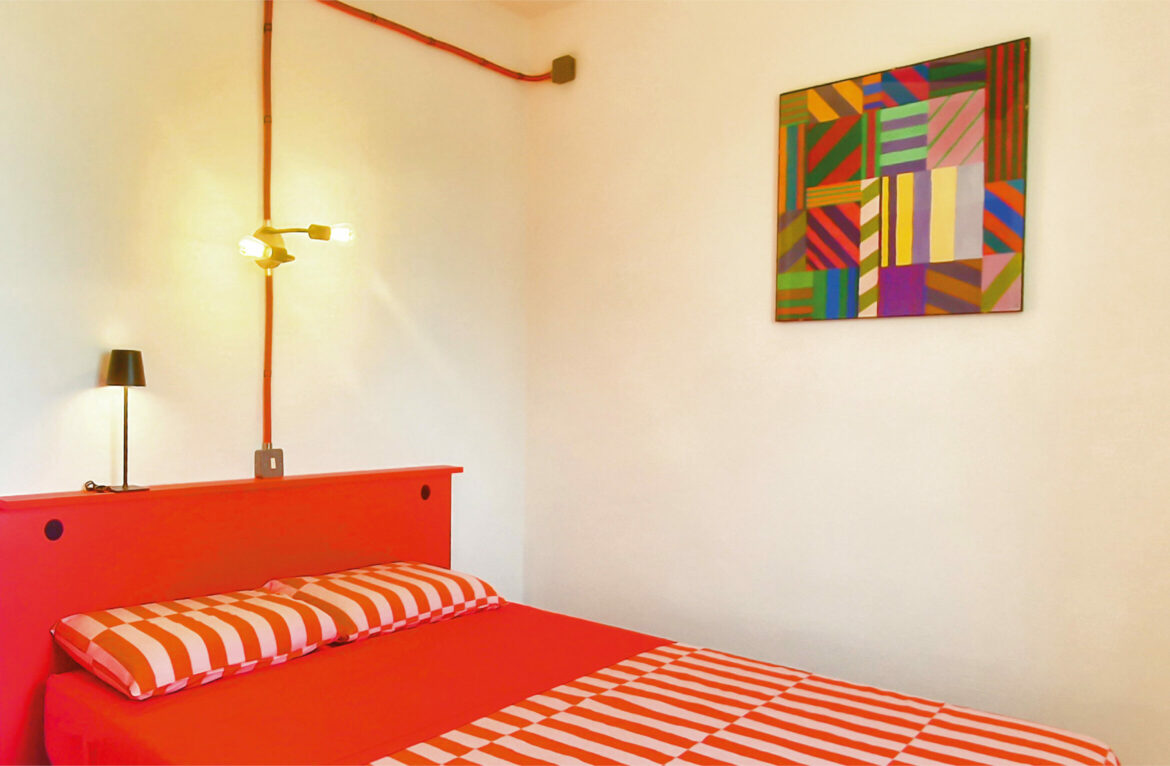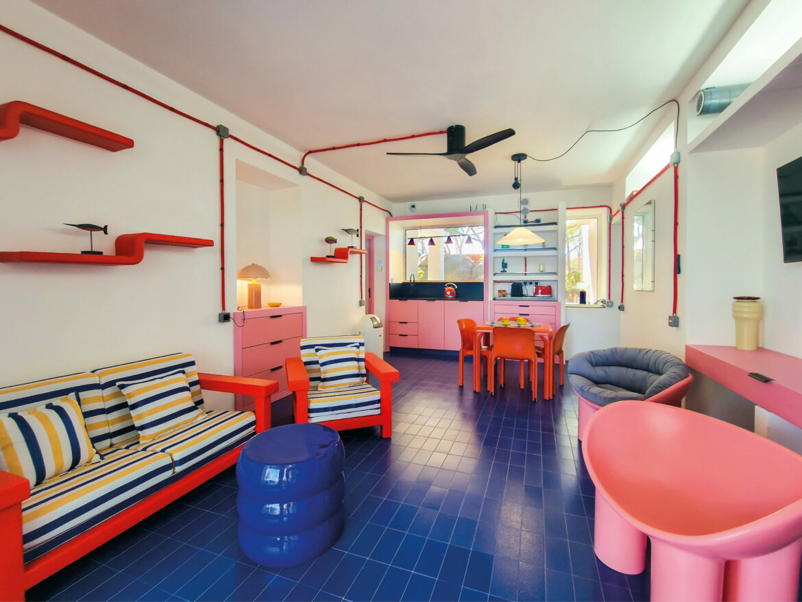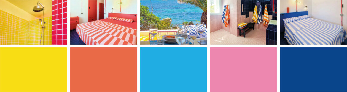 Régis a voulu garder et développer l’esprit pop des années 70 dans cette maison déjà dotée d’une base intéressante de matériaux et de couleurs. Il a conservé, restauré et mis en valeur des accessoires et pièces de mobilier présents dans la villa, ce qui a servi de fil conducteur vers une décoration très colorée, dans un style résolument aux antipodes des maisons de vacances situées aux alentours.